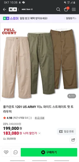풀카운트 1201 미육군 와이드 스트레이트 치노 트라우저 4종