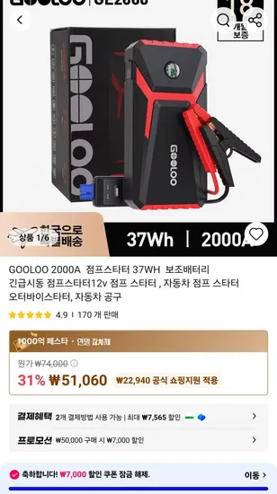 GOOLOO 000A 점프스타터 37WH 보조배터리 12V 2