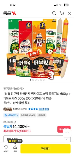 천하장사 빅사이즈 스틱 오리지날 600g 콰트로치즈 600g 12개