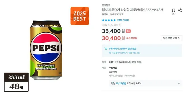 펩시 제로슈거 라임향 제로카페인 355ml 48개